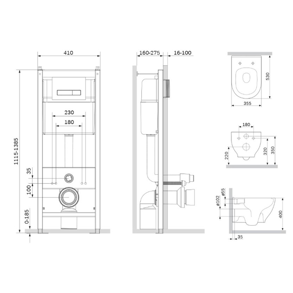 Полностью готовый к установке комплект: система инсталляции с клавишей подвесной унитаз с сиденьем. Неразборная рама из стального профиля выдерживает нагрузку до 400 кг. Полностью изолированный бачок с двухрежимной смывной арматурой. Укомплектован механической клавишей в цвете глянцевый хром. В комплекте все необходимые патрубки и крепления а также прокладка между унитазом и стеной - звукоизоляция.