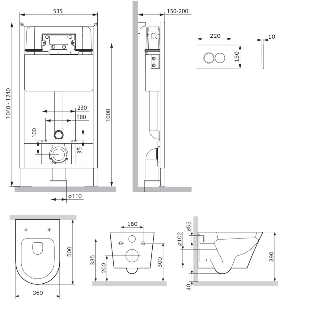 Полностью готовый к установке комплект: система инсталляции с клавишей подвесной унитаз с сиденьем.