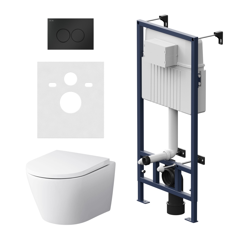 Полностью готовый к установке комплект: система инсталляции с клавишей подвесной унитаз с сиденьем.