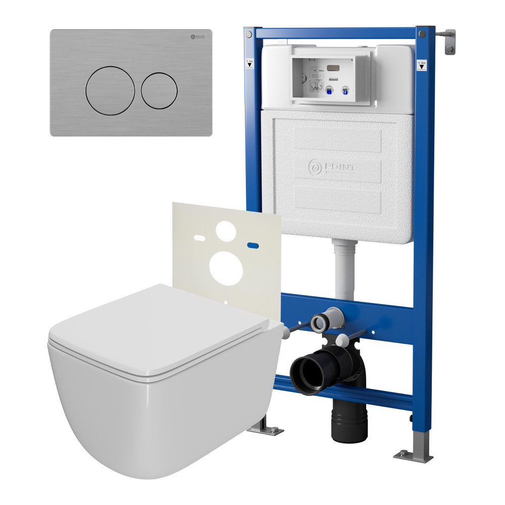 Сет: Система инсталляции Point Элемент для подвесного унитаза PN45120 + Клавиша смыва для инсталляции Point Виктория, нержавеющая сталь, сталь брашированная, PN44061SB + Унитаз подвесной Point Меркурий безободковый, сиденье дюропласт микролифт, быстросъем